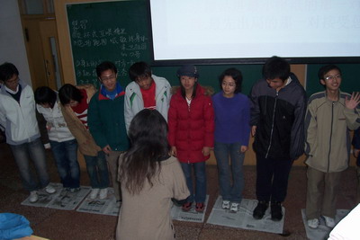 被随机选中的以宿舍为单位的同学们抽取同伴,共同挑战难度颇高的各项游戏:蔬菜蹲、快乐传递、趣味拔河等。“冬瓜蹲,冬瓜蹲,冬瓜蹲完香菜蹲”,随着节奏,组员将默契配合的精神发挥得淋漓尽致。快乐传递时的手舞足蹈,让台下的观众开怀大笑。欢聚会现场气氛热烈,惊喜连连,大家其乐融融,享受欢乐。06、07级的同学相互合作,在游戏中熟悉和了解。